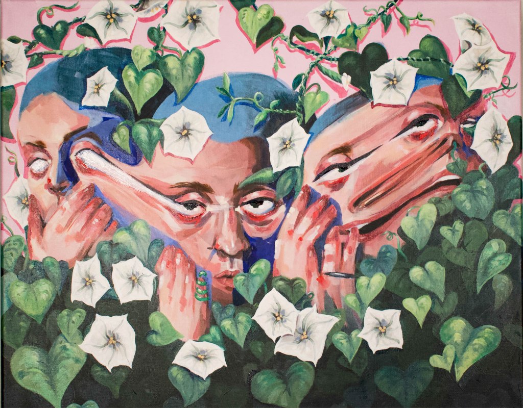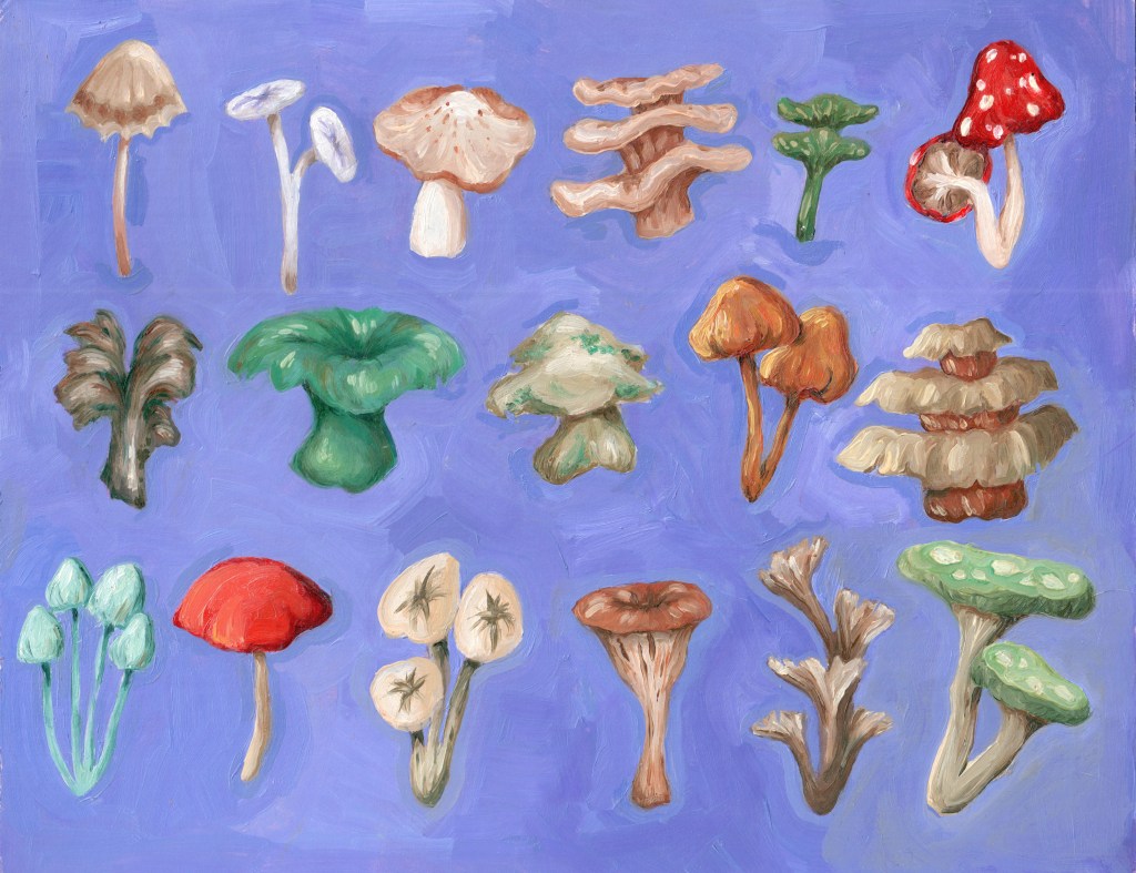 chromatique, 2018. 12×12″, Acrylic on wood. SoldMushies, 2022. 9×12″, Oil on canvas boardJoshua Tree, 2022. 8×8″, Oil on canvasYellowbelly, 2019. 20×18″, Oil on woodBluebottle, 2019. 12×20″, Oil on woodGreenlight, 2019. 36×20″, Oil on canvasIt was raining, 2017. 16×96″, Acrylic on wood panelsIt was raining (emergency), 2018. 48×36″, Acrylic on canvasI’m not the one that’s crazy, 2019. 48×36″, Acrylic on canvasMoonflower (too much), 2019. 20×30″, Acrylic on canvasbeyond the door, 20×20″, Acrylic on canvasEzra, 2017. 9×12″, Acrylic and glitter on wood spinner